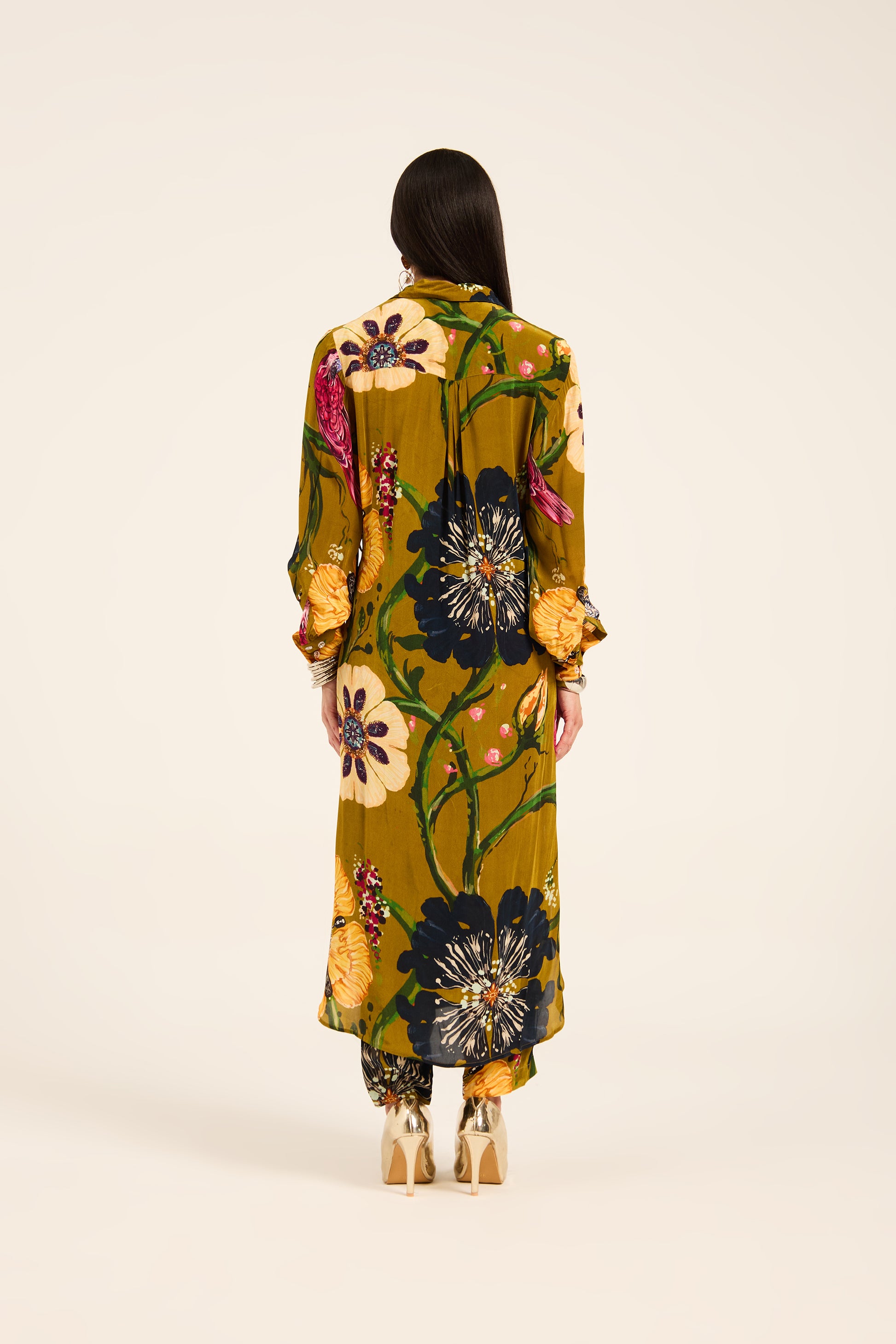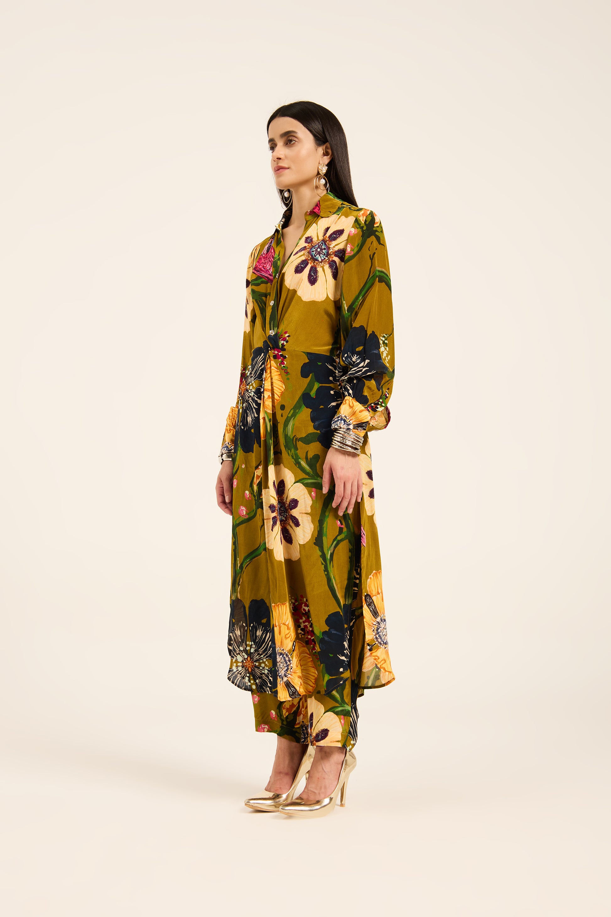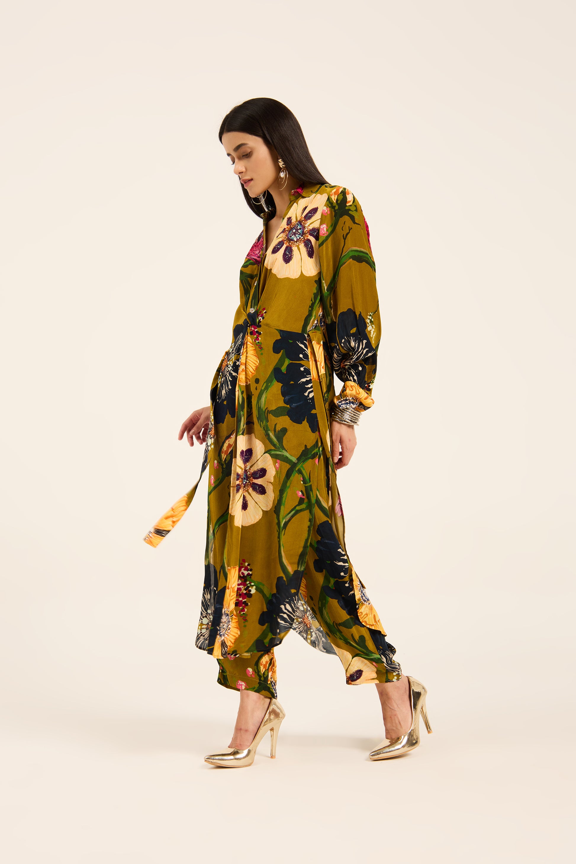 Breathe life into your everyday or occasion wear with this Ochre Yellow Kurta Set. The ensemble features a statement front-twisted kurta, designed to flatter with its cinched waist detail and effortless drape. Crafted in crepe fabric, the set is adorned with an all-over digital print featuring delicate floral and bird artwork motifs, capturing the charm of nature. Paired with coordinating straight-fit pants, this set is both stylish and supremely wearable.