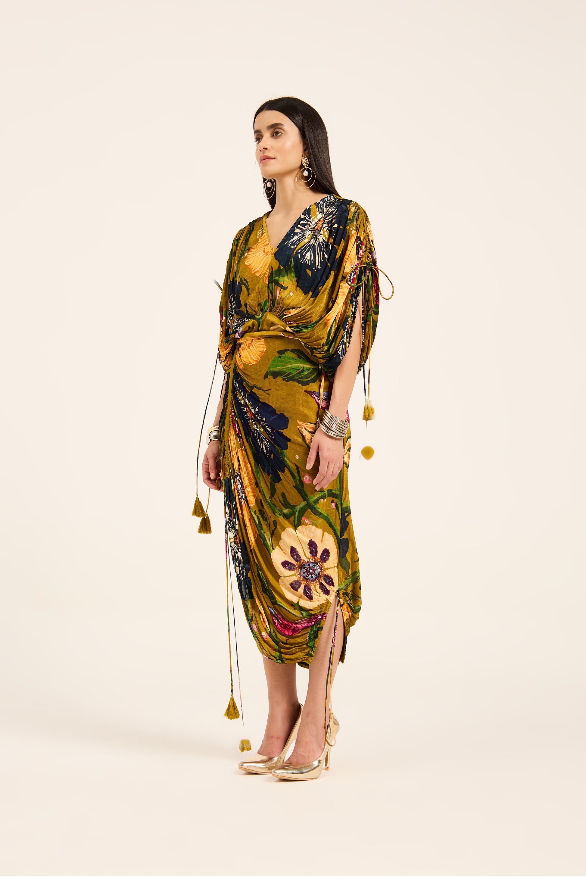 Celebrate free-spirited elegance in this Ochre Kaftan and Draped Skirt Set, where fluid silhouettes meet nature-inspired artistry. Crafted in a breezy, lightweight fabric, the set features an easy-fit kaftan top with soft gathered sleeves, cinched delicately with adjustable drawstrings to create a personalized shape. The draped skirt complements the top with graceful gathers and a flattering flow. Unifying the look is an enchanting all-over digital print of floral and bird motifs.