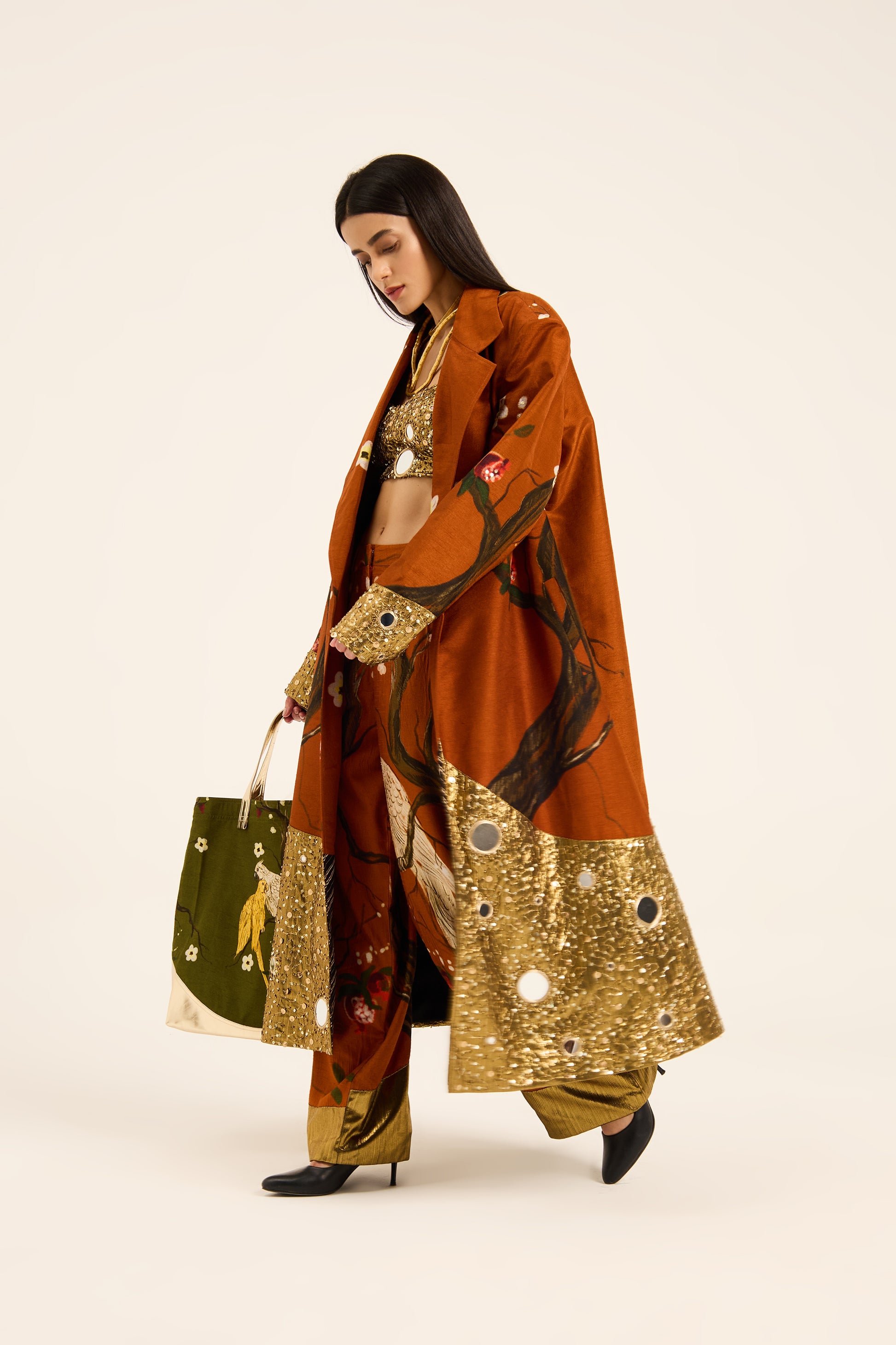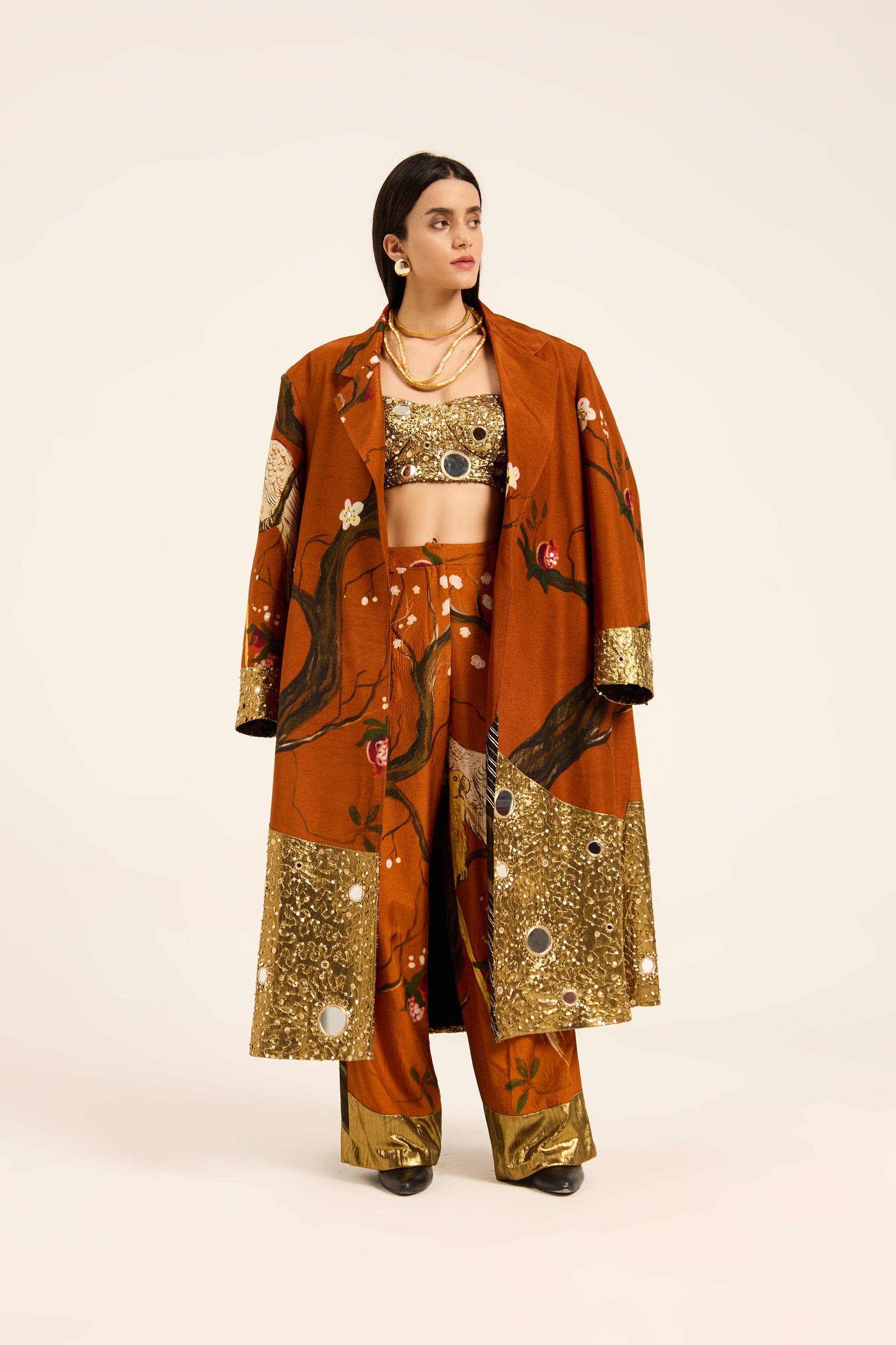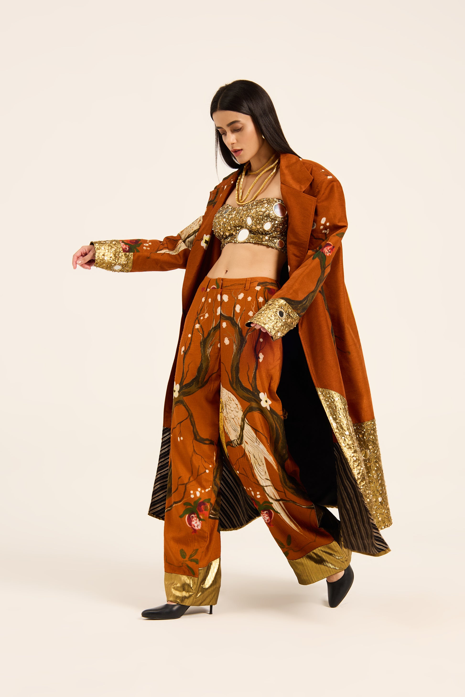 Introducing the Misora pants, a harmonious blend of traditional craftsmanship and contemporary design. The Rust Raw Silk Straight-Fit Pants with Golden Patch Detailing and Lovebirds Motif print are meticulously crafted to offer both elegance and comfort, making them a versatile addition to any wardrobe.