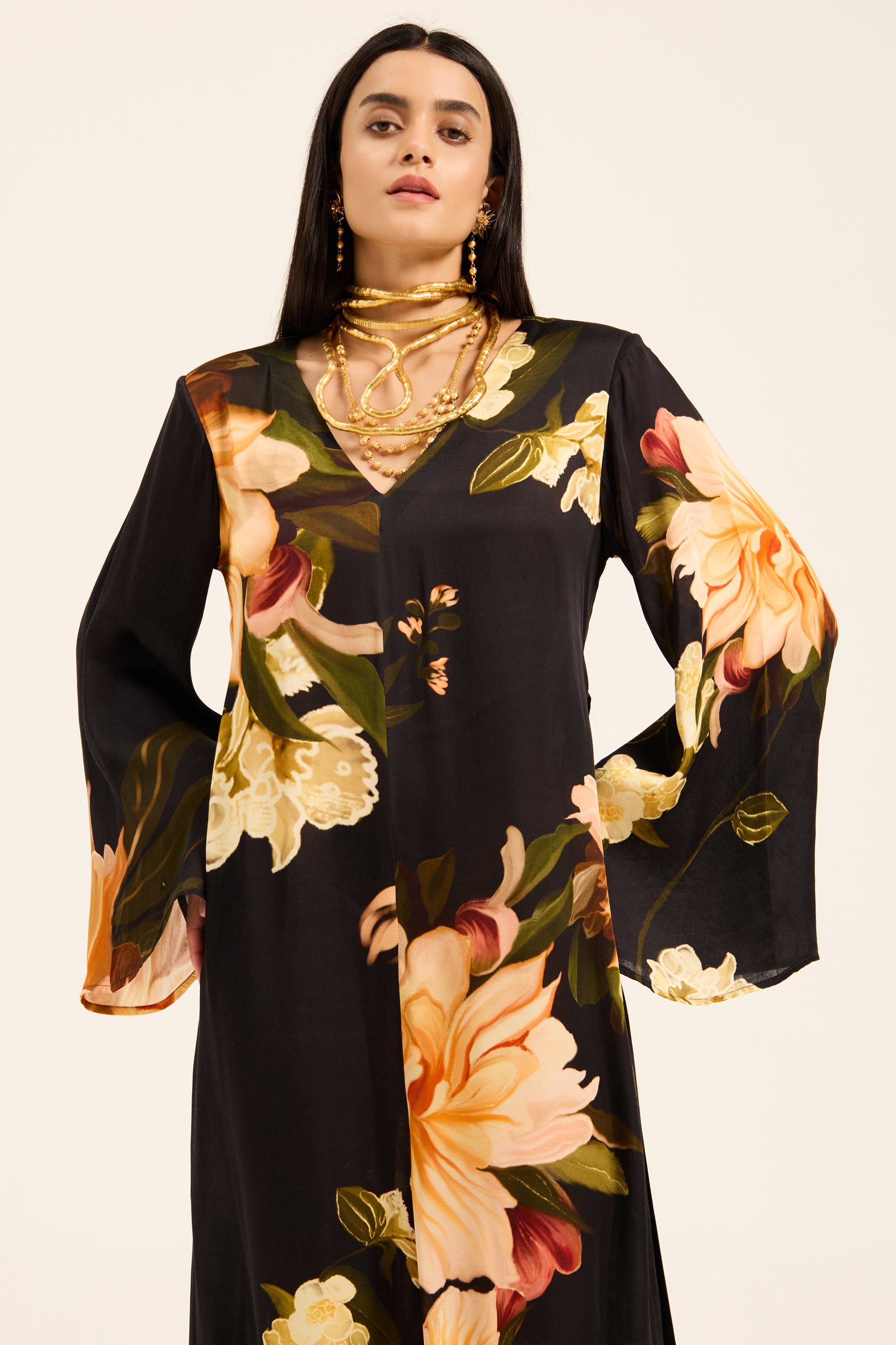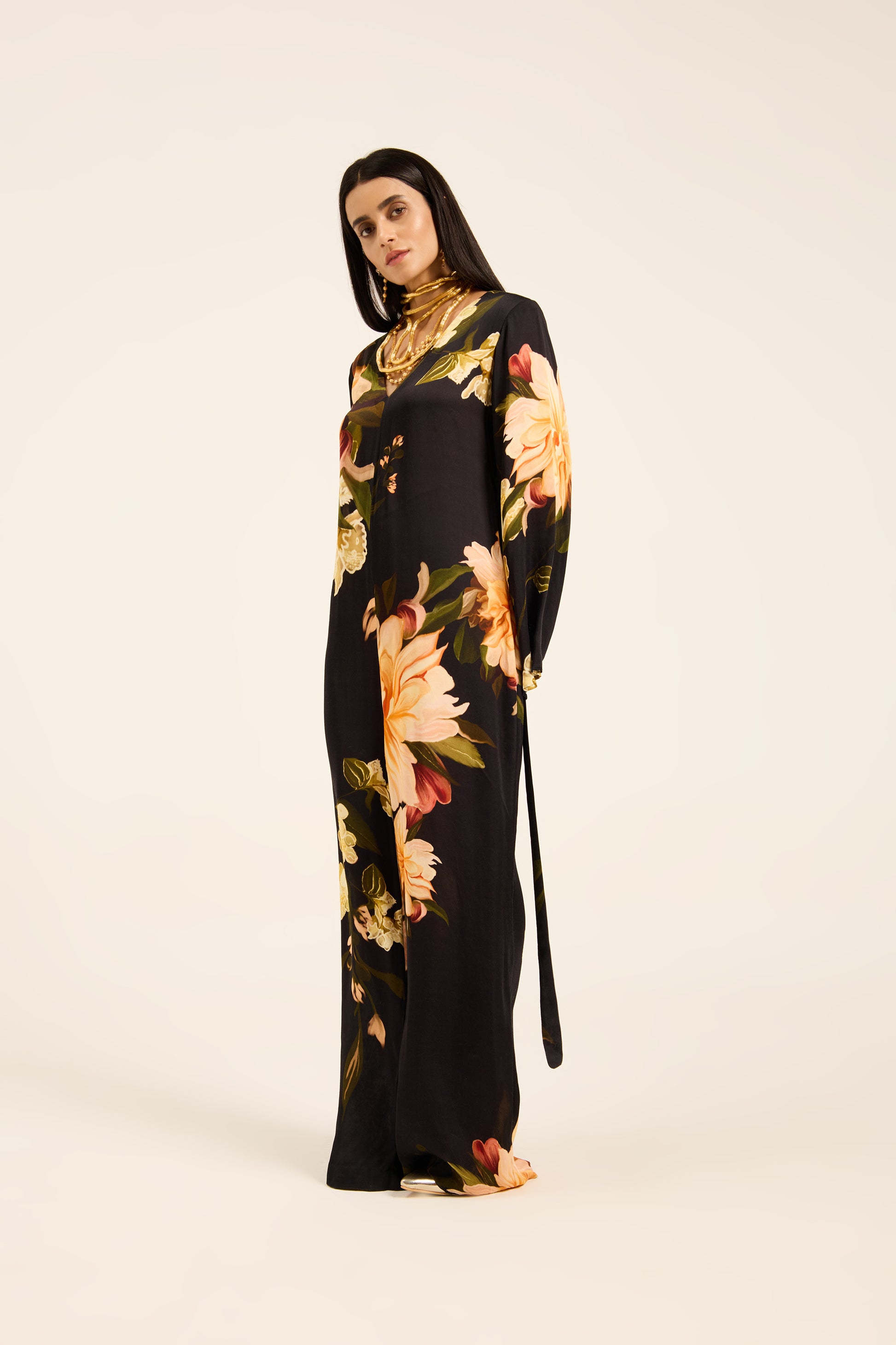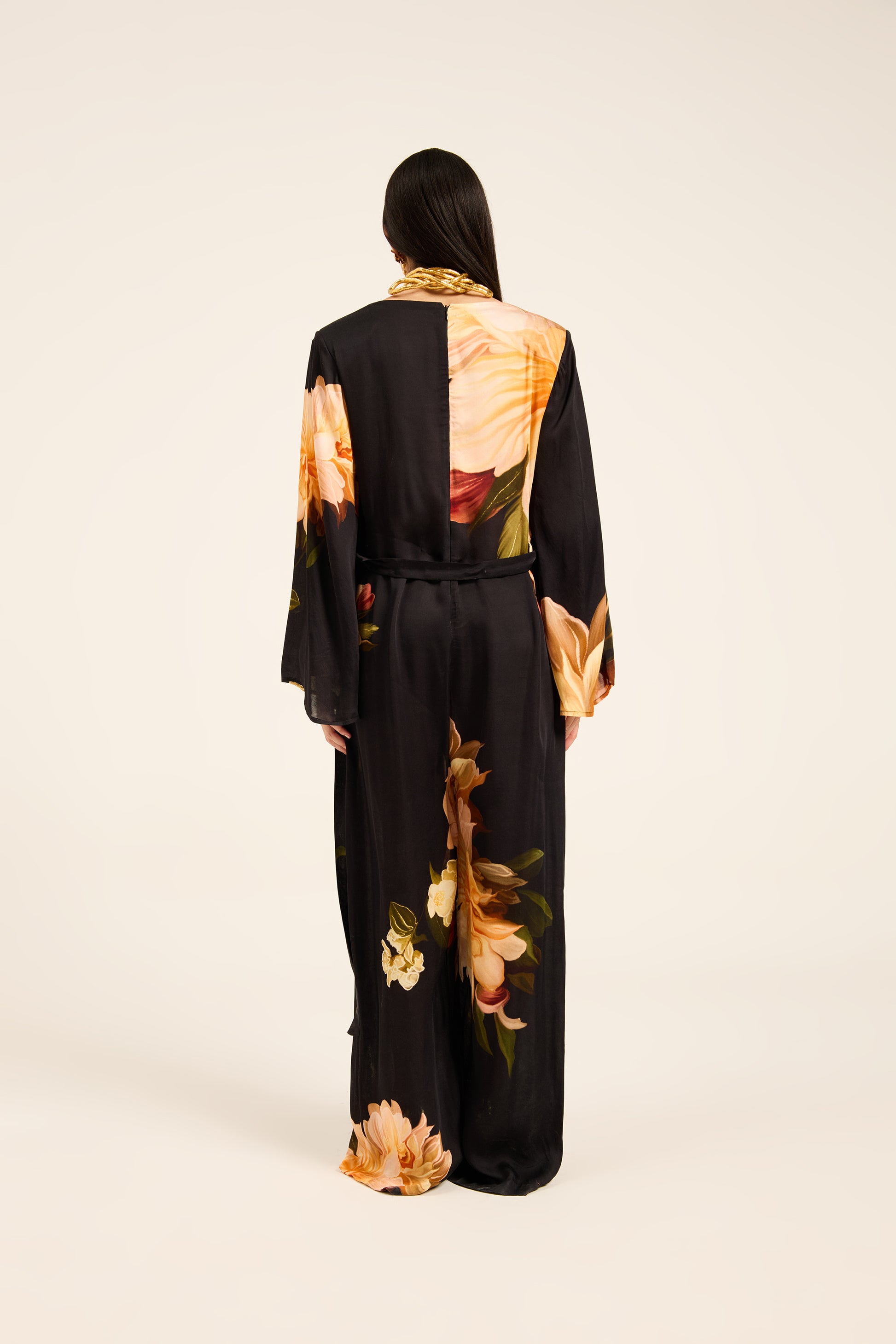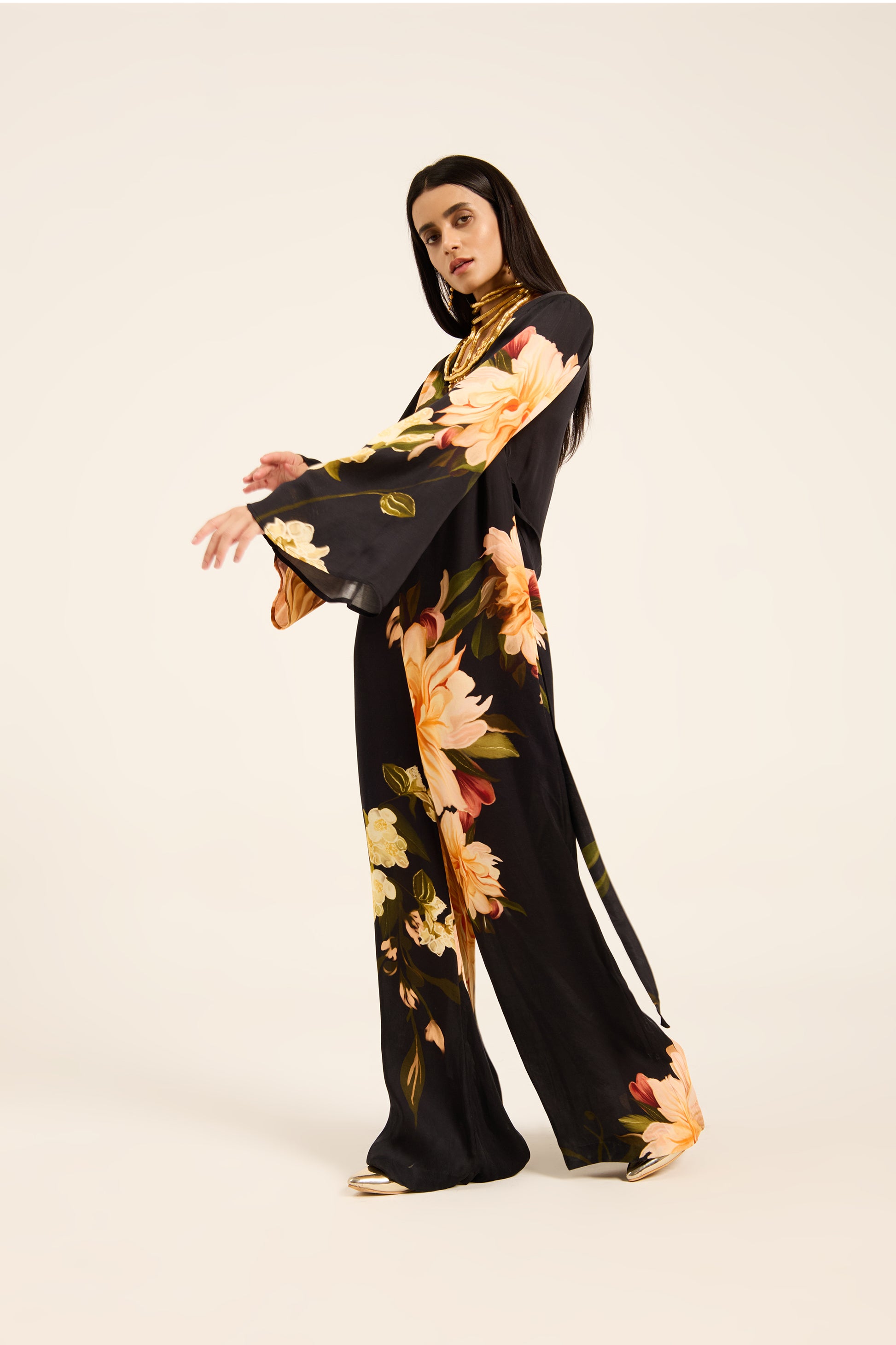 Elevate your wardrobe with the Yuri Satin Jumpsuit. Crafted from luxurious satin, this straight-fit jumpsuit is a standout piece, featuring a rich black base adorned with opulent floral prints that exude sophistication and glamour.Dramatic bell sleeves lend a soft, graceful movement, while structured shoulder pads give the outfit a defined, confident silhouette