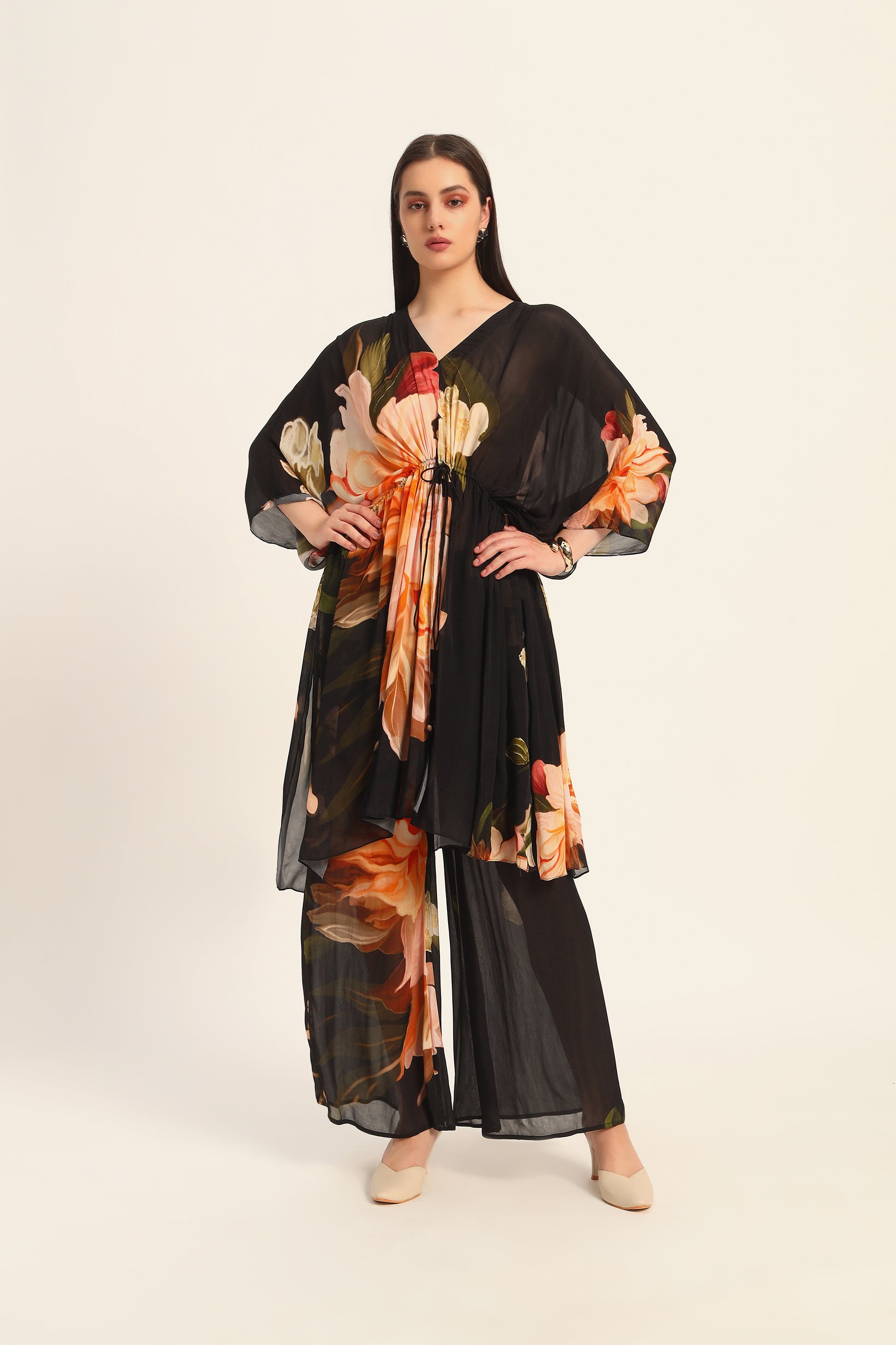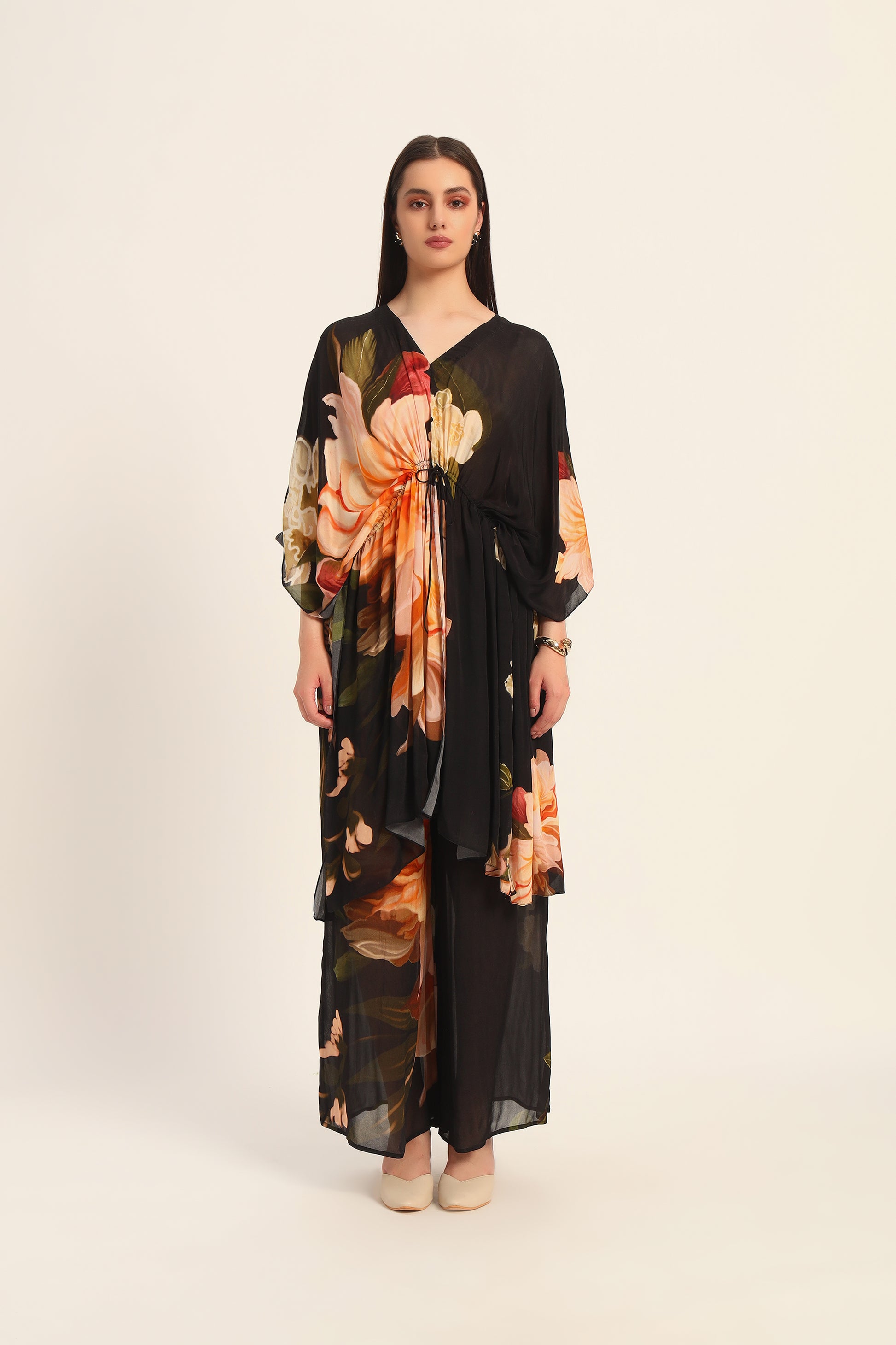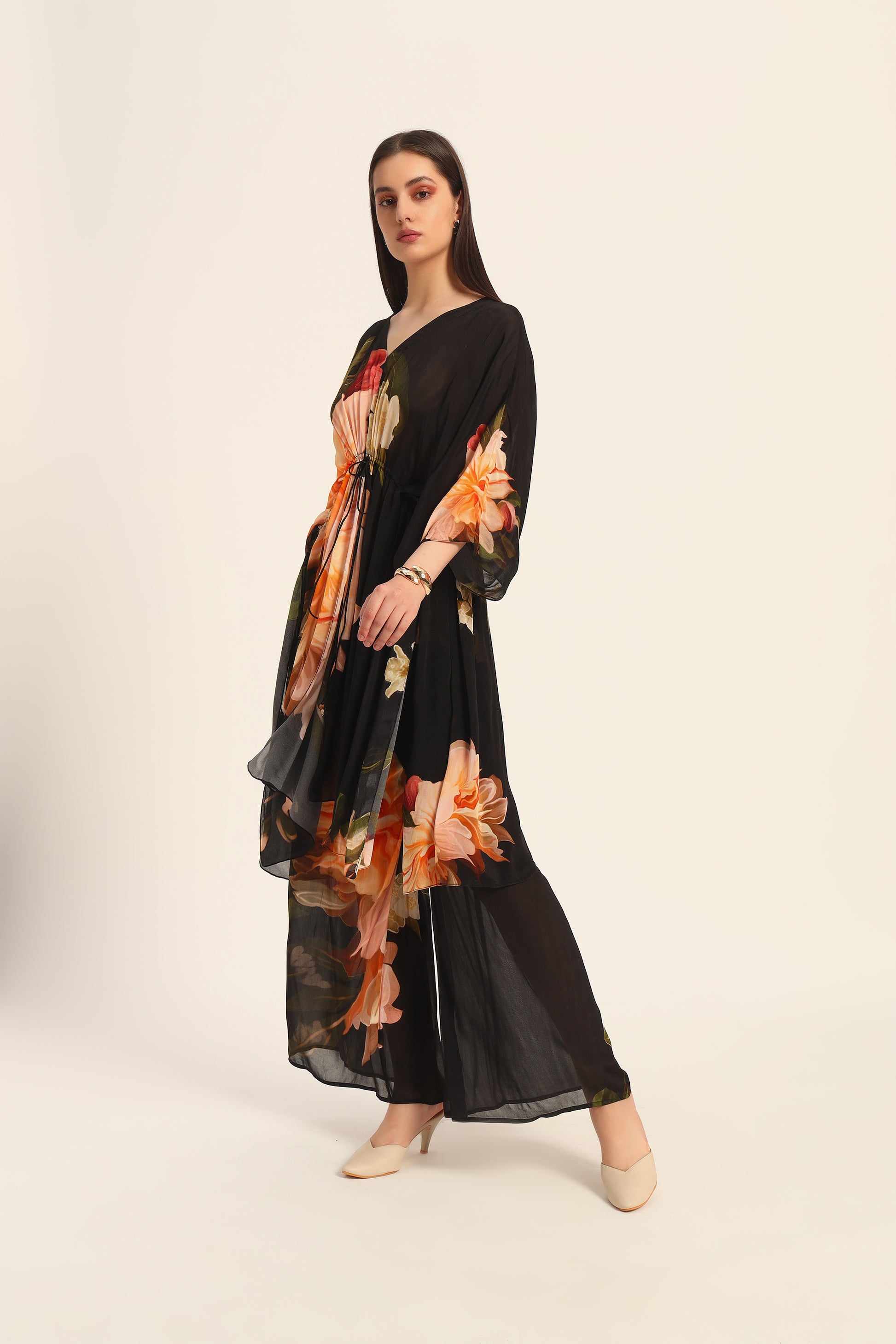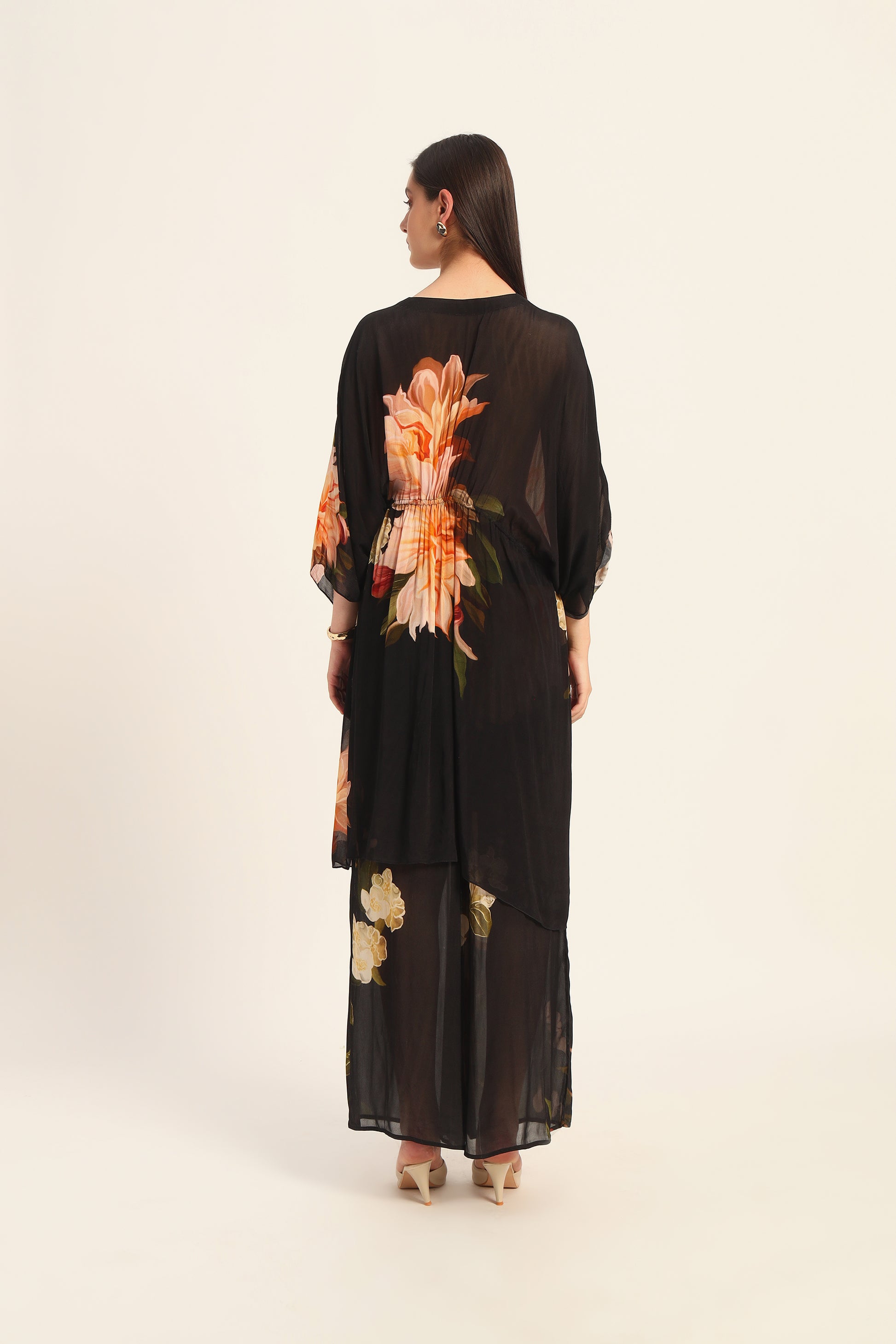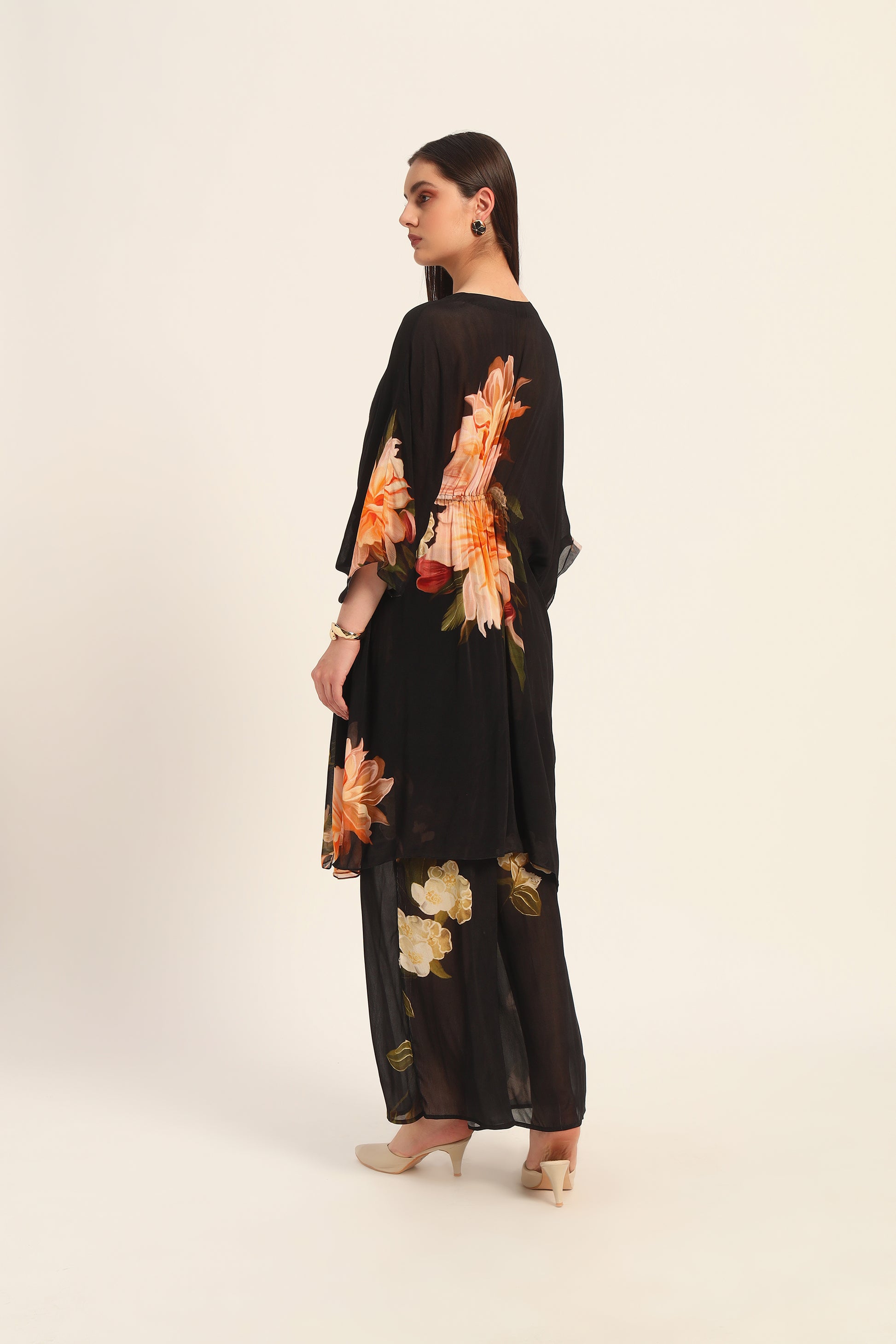 Introducing the Midnight Bloom Chiffon Kaftan Set, a harmonious blend of traditional elegance and contemporary design. This ensemble features a flowing chiffon kaftan-style kurta adorned with opulent golden floral motifs on a deep black base, paired with matching pants for a cohesive and sophisticated look.